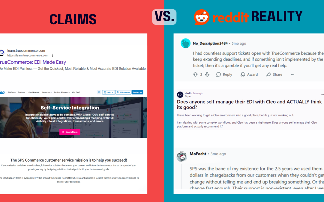 Cleo boasts their self-service model, claiming their platform offers full visibility and control in an easy to use way. (Image 1). The real users of Reddit often share frustrations with Cleo’s self-service model, voicing concern with how what they’re really selling is a complicated software that requires spending hours to barely move forward with their EDI needs. (Image 2).