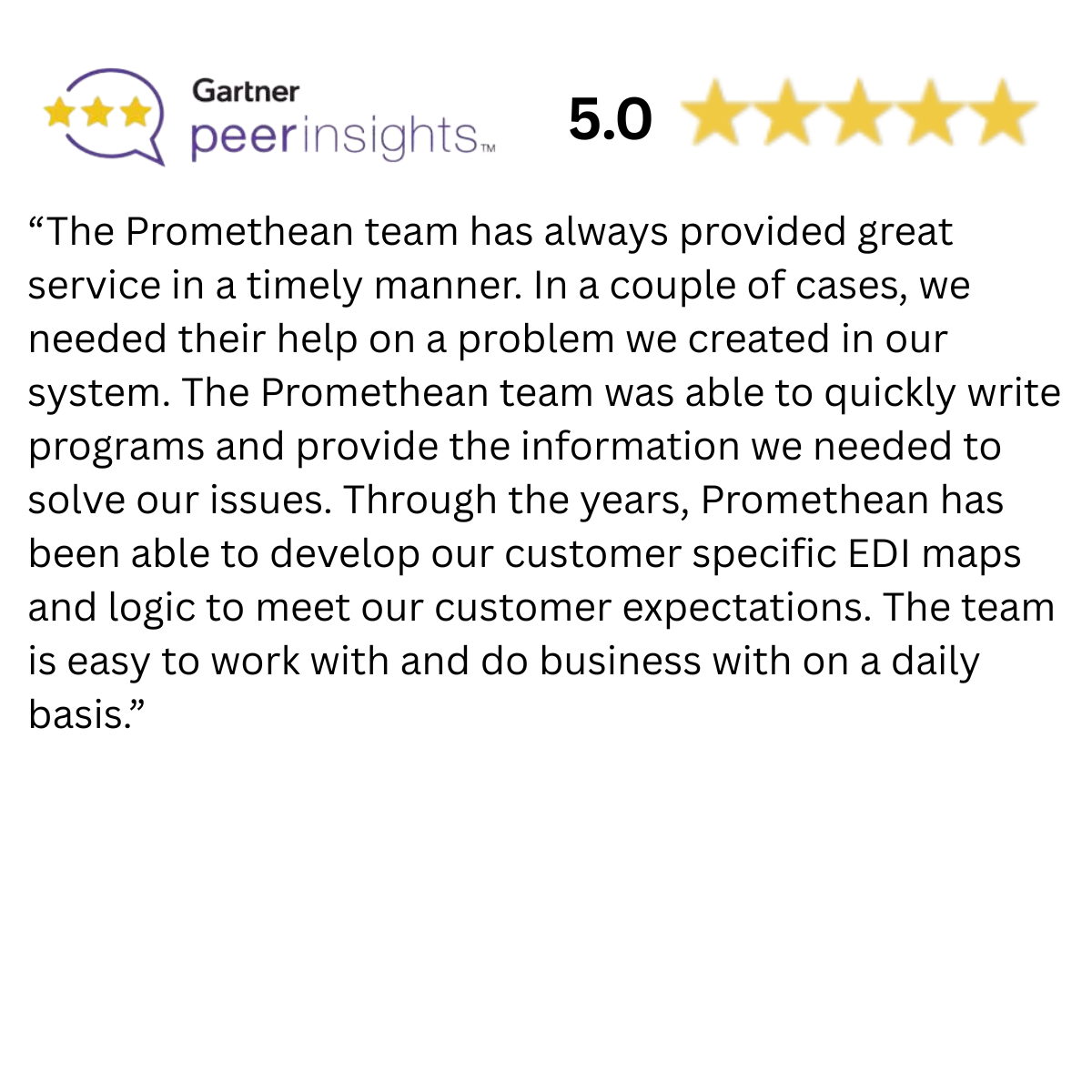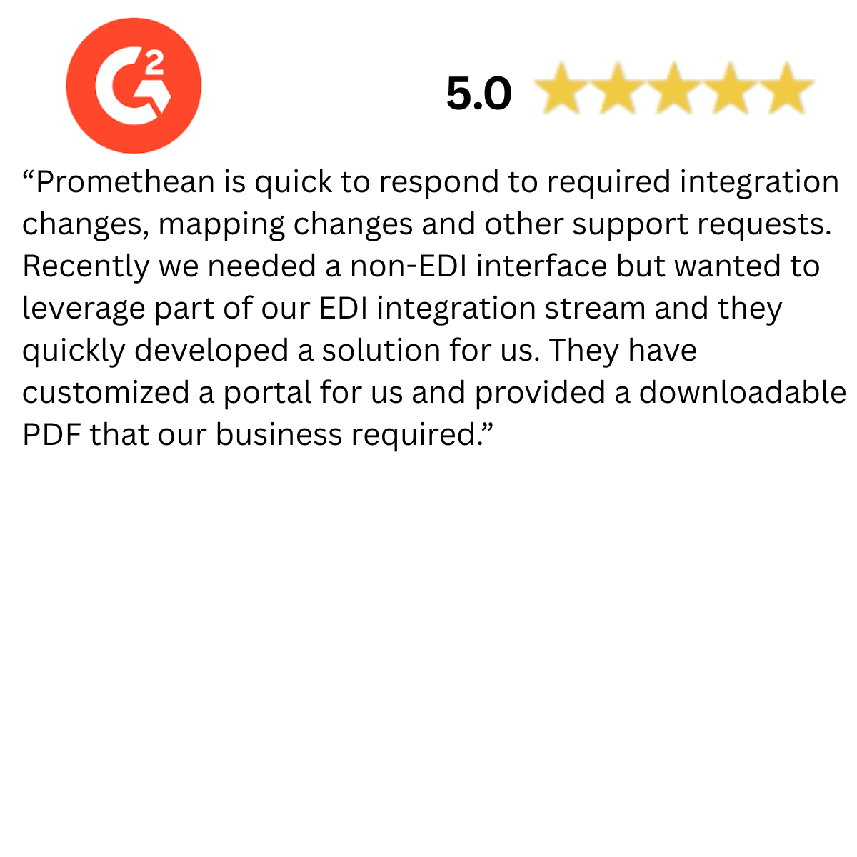 Promethean meets our needs to create new EDI trading partners, new transactions and support for existing trading partners/transactions. Their capabilities have allowed us to effectively outsource this service at an overall cost savings. Promethean’s turnkey services provide us with a single point of contact, minimizing coordination and ensuring that our transactions are moved between trading partners and translated without error or loss. Issues that identified are addressed immediately and resolved quickly without any disruption in our production process.